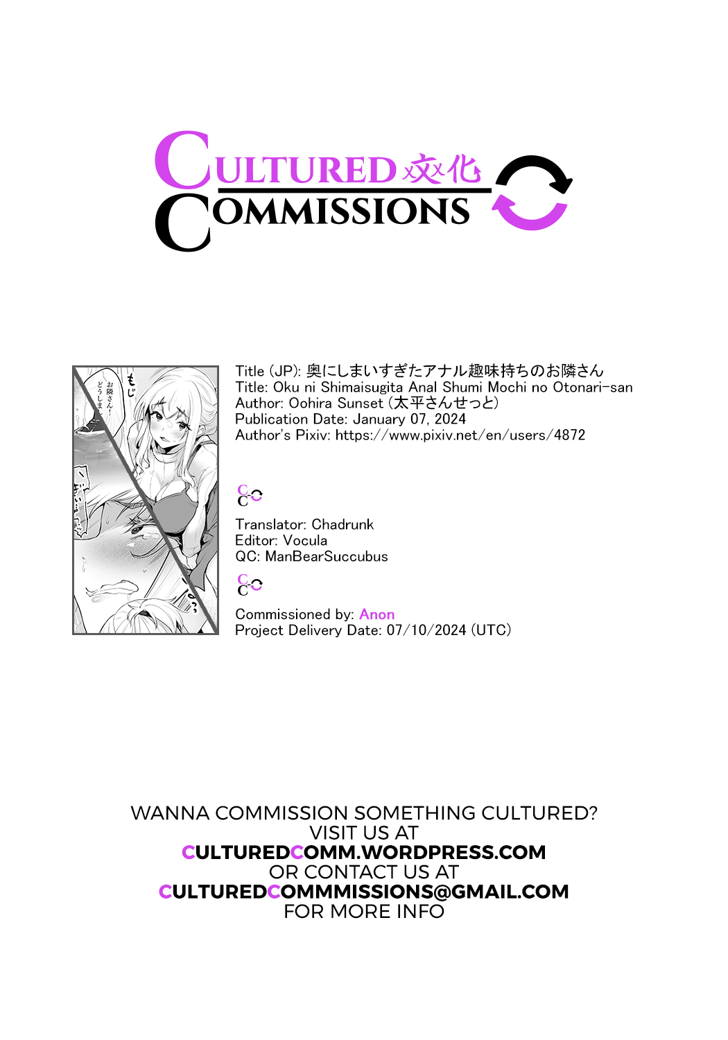 [Oohira Sunset] Oku ni Shimaisugita Anal Shuumi Mochi no Otonari-san | The Neighbor with a Fetish for Hiding Things Deep in her Anus [English] [CulturedCommissions][太平さんせっと] 奥にしまいすぎたアナル趣味持ちのお隣さん [英訳]#518790 Parodies: original84K Characters: Tags: anal97Kahegao43Ksex toys31Ksquirting5Klarge insertions2Kgaping1Kfocus anal1Kprolapse1Kanal prolapse38 Artists: oohira sunset7 Groups: Languages: translated204Kenglish112K Categories: doujinshi375KPages: 10 Uploaded: 3 weeks, 2 days ago