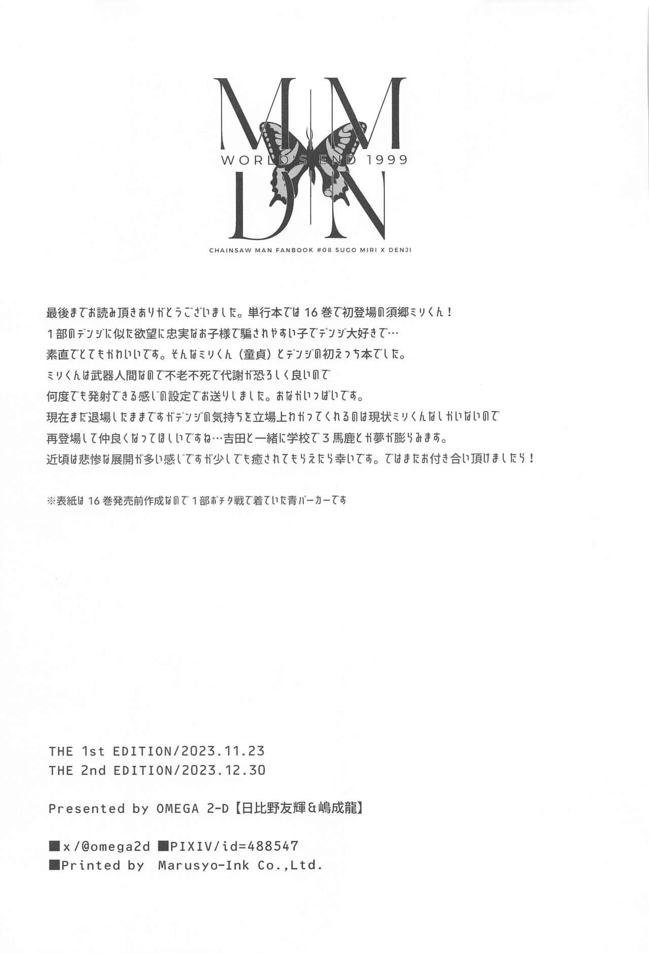 (C103) [OMEGA 2-D (Hibino Tomoki, Shima Seiryuu)] MMDN - WORLD'S END 1999 (Chainsaw Man)(C103) [OMEGA2‐D (日比野友輝、嶋成龍)] MMDN - WORLD'S END 1999 (チェンソーマン)#521424 Parodies: chainsaw man239 Characters: denji100 Tags: yaoi49Kmales only42K Artists: Groups: omega 2-d46 Languages: japanese271K Categories: doujinshi374KPages: 34 Uploaded: 9 seconds ago