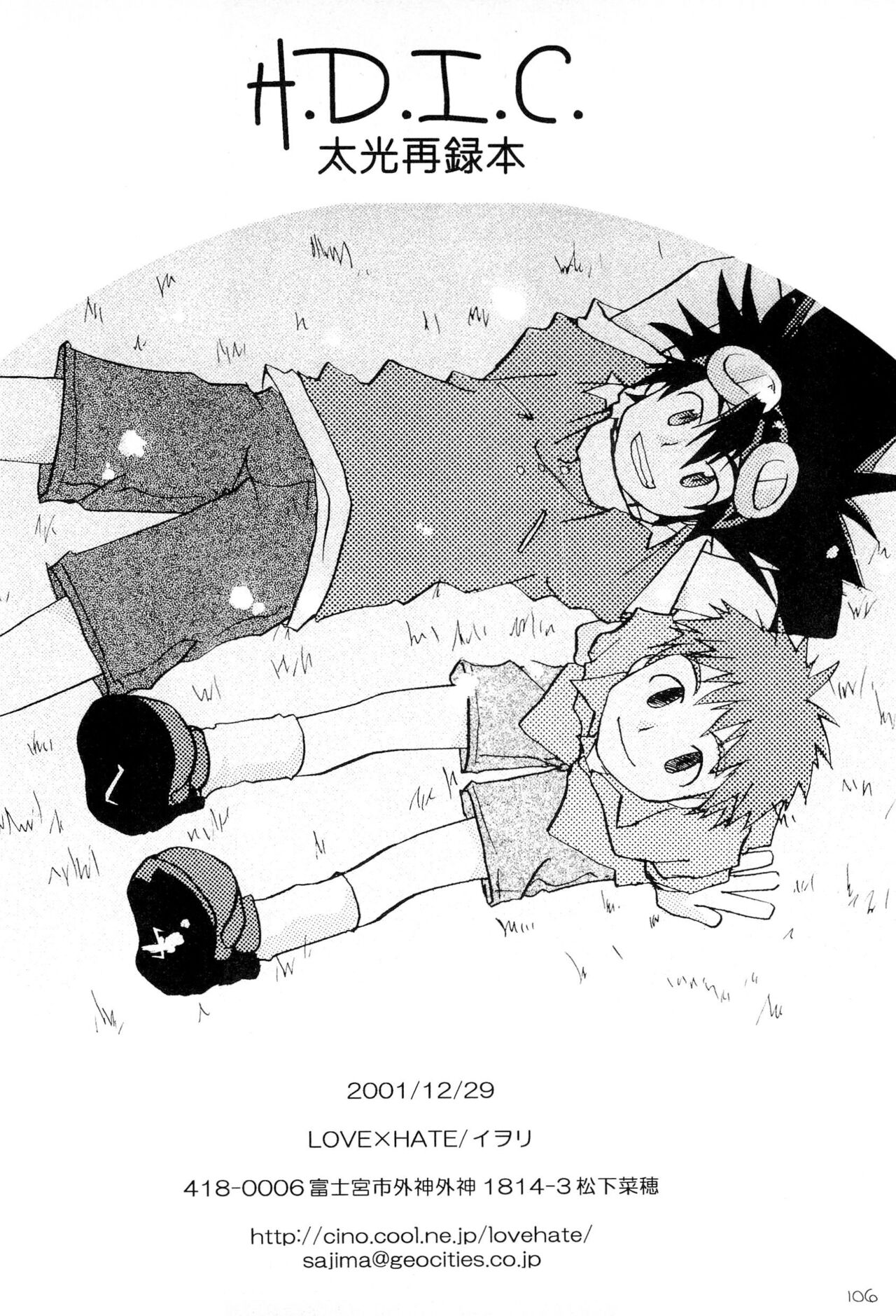 (C61) [LOVE×HATE (Iori)] H.D.I.C. (Digimon Adventure)(C61) [LOVE×HATE (イヲリ)] H.D.I.C. (デジモンアドベンチャー)#520215 Parodies: digimon adventure253 Characters: tai kamiya128izzy izumi38 Tags: yaoi50Kmales only42K Artists: Groups: Languages: japanese273K Categories: doujinshi377KPages: 112 Uploaded: 3 weeks, 6 days ago