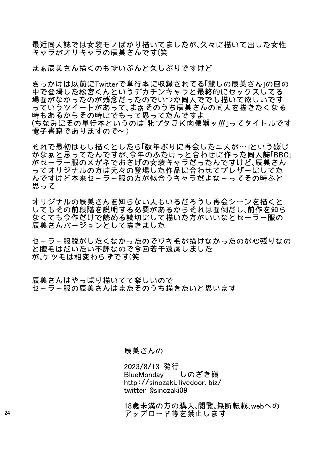 [BlueMonday (Shinozaki Rei)] Tatsumi-san no [English] [Doujins.com] [Digital][BlueMonday (しのざき嶺)] 辰美さんの [英訳] [DL版]#520505 Parodies: original83K Characters: Tags: big breasts163Ksole female138Ksole male122Knakadashi79Kschoolgirl uniform74Kblowjob71Kglasses65Khairy20Kbig penis20Kbig ass16Kschoolboy uniform16Kbbw7Kemotionless sex1K Artists: shinozaki rei273 Groups: Languages: translated203Kenglish111K Categories: doujinshi373KPages: 24 Uploaded: 14 seconds ago